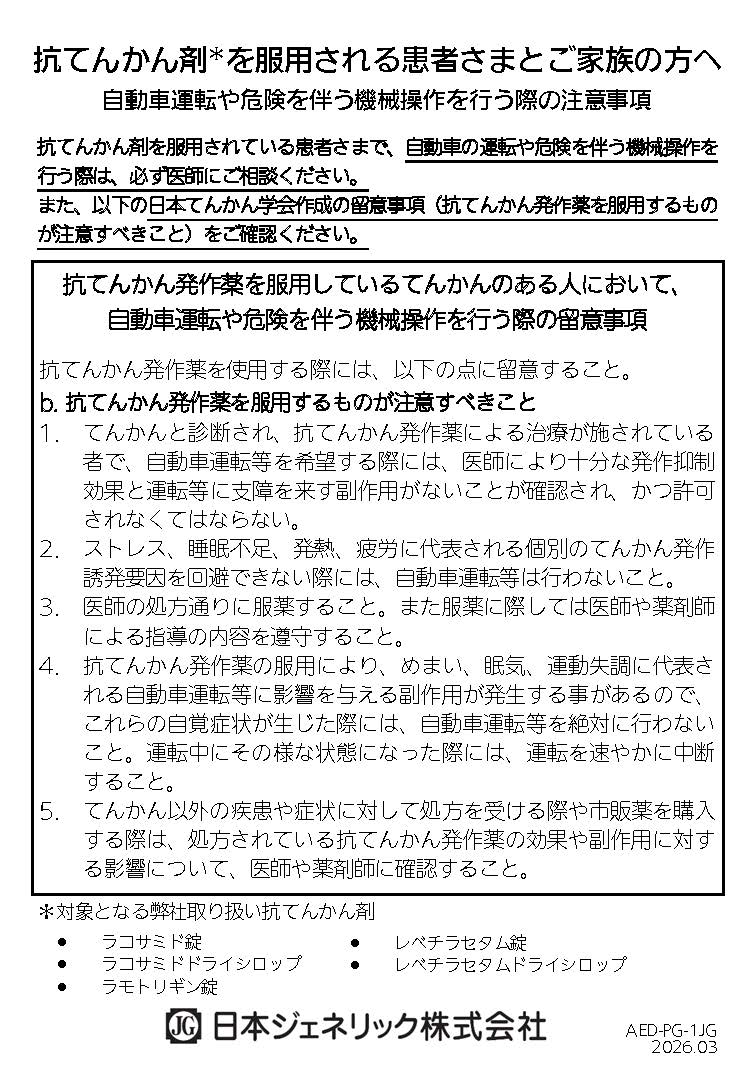 レベチラセタム錠/ドライシロップ「JG」服用される患者さまとご家族の方へ