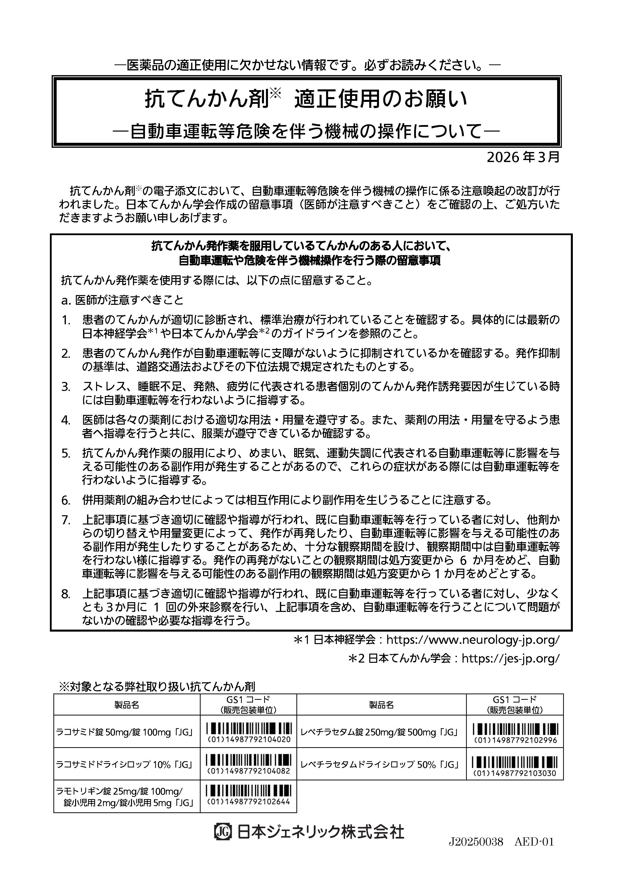抗てんかん剤 適正使用のお願い-自動車運転等危険を伴う機械の操作について-