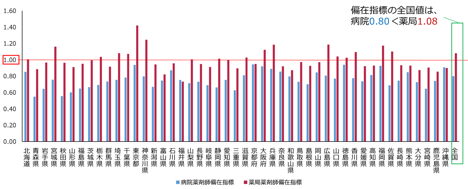 それによると、届出薬剤師数は増加傾向にあり、薬局薬剤師数は右肩上がりでの増加が続いているが、病院薬剤師数は概ね横ばいで推移。薬剤師の充足状況を示す偏在指標は、薬局薬剤師では18都道府県で目標値の1.0を超えたが、病院薬剤師で1.0を超える都道府県はなかった(資料1)。