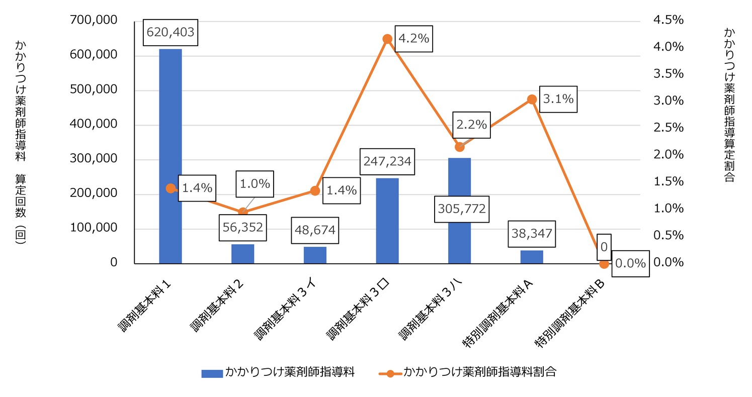 薬局の体制を評価する「地域支援体制加算」は38.4%の薬局が4つある区分のいずれかを届出ており、「調剤基本料1」の薬局の届出割合は約4割、それ以外の薬局は約3割だった。