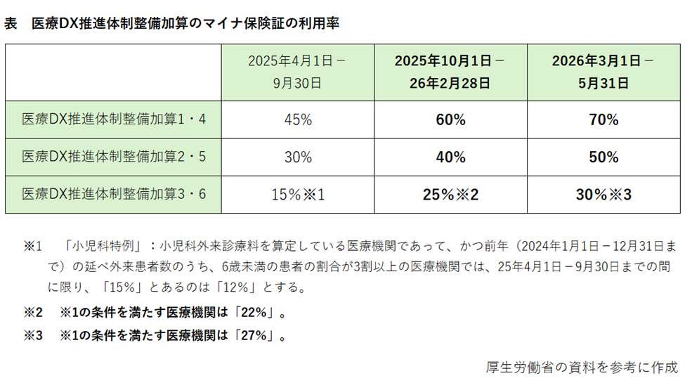 26年3月からの基準は同年5月までの3カ月間適用する。ただ、マイナ保険証の利用率は小児の患者で低いことが分かっているため、医療DX推進体制整備加算3と加算6で利用率の基準を緩和する、医科のいわゆる「小児科特例」は継続する。