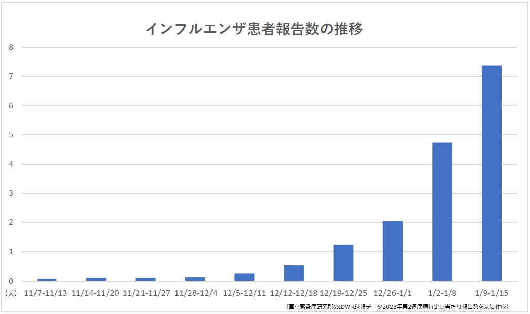 〔インフルエンザ〕報告数は前週比約55.8%増の7.37人。過去10年の同期の平均よりも少ない。都道府県別の上位3位は、沖縄(33.23人)、福岡(16.96人)、宮崎(16.63人)。