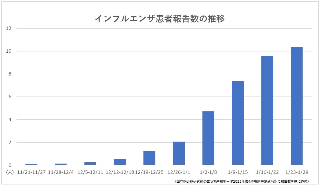 国立感染症研究所がまとめた1月23日から29日までの1週間(第4週)の5類感染症の患者報告(小児科定点医療機関約3,000カ所、インフルエンザ定点医療機関約5,000カ所、速報値)によると、インフルエンザの患者報告数が9週連続で増加した。RSウイルス感染症は2週連続で増えた。感染性胃腸炎は減少した。A群溶血性レンサ球菌咽頭炎は横ばいだった。