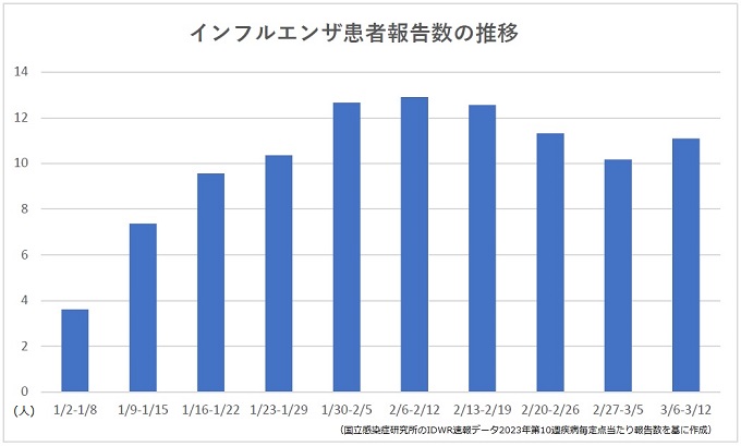 国立感染症研究所がまとめた6日から12日までの1週間(第10週)の5類感染症の患者報告(小児科定点医療機関約3,000カ所、インフルエンザ定点医療機関約5,000カ所、速報値)によると、3週連続で減少していたインフルエンザの定点医療機関当たりの患者報告数が増加に転じた。A群溶血性レンサ球菌咽頭炎、RSウイルス感染症は2週連続で増加。感染性胃腸炎は3週連続で減少した。