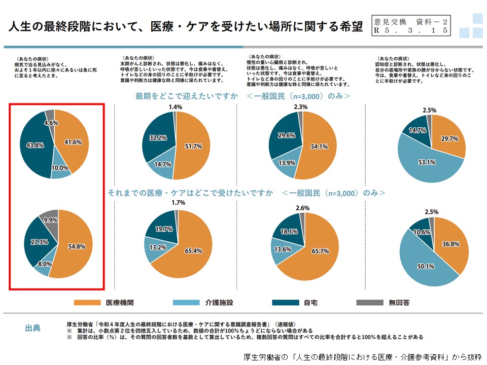 こうしたことから、厚労省は、本人の意思決定に基づいた医療・介護を提供するために関係者間で更に連携し、どのような場所でも充実した緩和ケアを提供できるよう議論を促した。